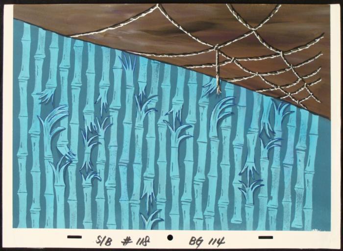 This original hand-painted background from the Nickelodeon TV show SpongeBob Squarepants. The story takes place under the deep blue sea in Bikini Bottom, where SpongeBob resides. SpongeBob, who is a yellow, porous sponge, is your typical happy-go-lucky character, as he is always cheerful and enjoys making people laugh. Patrick Star, SpongeBob's neighbor who is a starfish, is your average children's show idiot, as he boasts knowing nothing and is often getting himself into ridiculous situations. Between the homes of these two lies the home of the miserable Squidward, a squid, who is known for being grouchy and playing tricks on SpongeBob and Patrick. Both SpongeBob and Squidward work at the Krusty Krab, a fast food business run by the greedy money-loving Mr. Krabs, a crab, the arch rival of the evil, possibly misunderstood, Plankton. Another neighbor, Sandy Cheeks, an athletic squirrel who normally wears an astronaut's space suit, was introduced in "Tea at the Treedome." She spends most of her time inventing and experimenting. SpongeBob's walls are ripping apart.Original Production Background Overall Size of Background: 10" x 14" Very good conditionOriginal Production Backgrounds are used in the making of the final version of animated productions. The background establishes the location and the overall good mood of the scenee. Typically, a background layout artist creates a drawing to establish the content of the scene, placement of characters, perspective and camera angle. Based on this drawing, the background artist creates a preliminary painting to confirm all of the scenes details, then the final production background which is used in the filming of the scene. When these backgrounds are individually photographed behind the progression of production cels, and projected at a rapid succession, the images in the foreground appear to move, creating an animated scene. The background is ready to be matted and framed. It is a colored background with the animator's notations at the bottom.