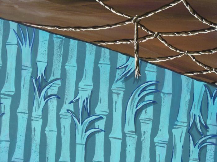 This original hand-painted background from the Nickelodeon TV show SpongeBob Squarepants. The story takes place under the deep blue sea in Bikini Bottom, where SpongeBob resides. SpongeBob, who is a yellow, porous sponge, is your typical happy-go-lucky character, as he is always cheerful and enjoys making people laugh. Patrick Star, SpongeBob's neighbor who is a starfish, is your average children's show idiot, as he boasts knowing nothing and is often getting himself into ridiculous situations. Between the homes of these two lies the home of the miserable Squidward, a squid, who is known for being grouchy and playing tricks on SpongeBob and Patrick. Both SpongeBob and Squidward work at the Krusty Krab, a fast food business run by the greedy money-loving Mr. Krabs, a crab, the arch rival of the evil, possibly misunderstood, Plankton. Another neighbor, Sandy Cheeks, an athletic squirrel who normally wears an astronaut's space suit, was introduced in "Tea at the Treedome." She spends most of her time inventing and experimenting. SpongeBob's walls are ripping apart.Original Production Background Overall Size of Background: 10" x 14" Very good conditionOriginal Production Backgrounds are used in the making of the final version of animated productions. The background establishes the location and the overall good mood of the scenee. Typically, a background layout artist creates a drawing to establish the content of the scene, placement of characters, perspective and camera angle. Based on this drawing, the background artist creates a preliminary painting to confirm all of the scenes details, then the final production background which is used in the filming of the scene. When these backgrounds are individually photographed behind the progression of production cels, and projected at a rapid succession, the images in the foreground appear to move, creating an animated scene. The background is ready to be matted and framed. It is a colored background with the animator's notations at the bottom.
