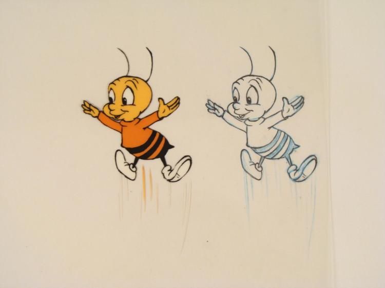 Here, it appears that Buzz is soaring through the air. This is an original animation cel & drawing from the production of the Cheerios cereal commercial. * Medium: Hand painted acetate cel with drawing * Cel size: 10 1/2 x 12 1/2 inchesDrawing size: 10 1/2 x 12 1/2 inches * Details: Number and peg holes at the bottom edgeCondition: Very goodPencil color: non-photo blue and black