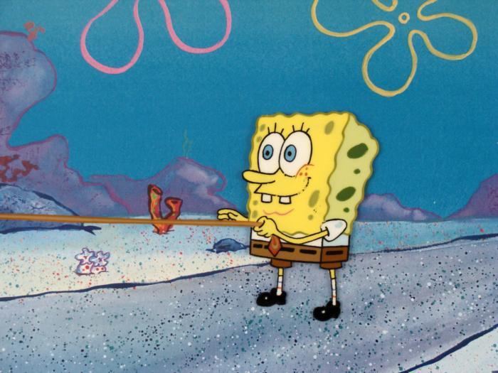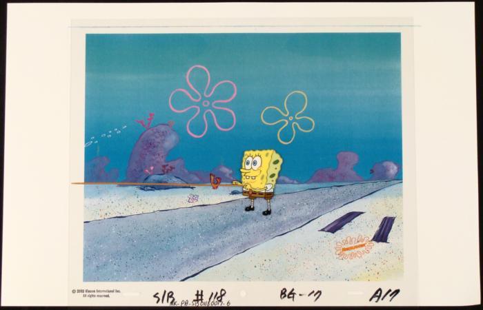 This animation cel and reproduction background are from the Nickelodeon TV show SpongeBob Squarepants. The story takes place under the deep blue sea in Bikini Bottom, where SpongeBob resides. SpongeBob, who is a yellow, porous sponge, is your typical happy-go-lucky character, as he is always cheerful and enjoys making people laugh. Patrick Star, SpongeBob's neighbor who is a starfish, is your average children's show idiot, as he boasts knowing nothing and is often getting himself into ridiculous situations. Between the homes of these two lies the home of the miserable Squidward, a squid, who is known for being grouchy and playing tricks on SpongeBob and Patrick. Both SpongeBob and Squidward work at the Krusty Krab, a fast food business run by the greedy money-loving Mr. Krabs, a crab, the arch rival of the evil, possibly misunderstood, Plankton. Another neighbor, Sandy Cheeks, an athletic squirrel who normally wears an astronaut's space suit, was introduced in "Tea at the Treedome." She spends most of her time inventing and experimenting. What is SpongeBob holding? Original Printed Background and Animated Cel Overall Size of Background: 11" x 17" Overall Size of the Cel: 10 1/2" x 12 1/2" Very good condition This is an original hand-painted cel set-up used in the production of an episode of "SpongeBob SquarePants." Each one-of-a-kind set-up represents a slight change in position of the characters. When individually photographed and projected in rapid succession, the images appear to move.