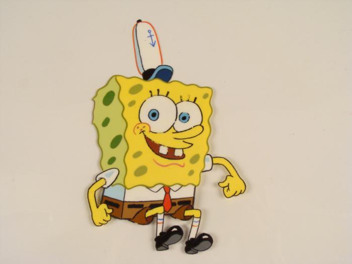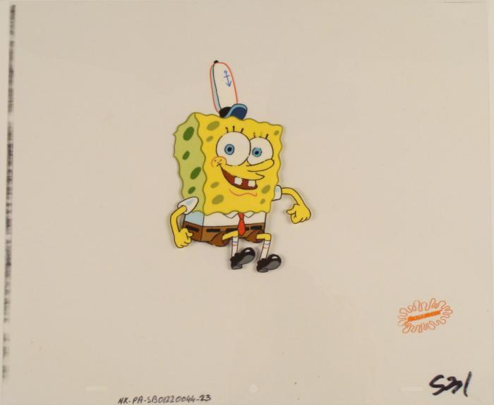 This original animation cel is from the Nickelodeon TV show SpongeBob Squarepants. The story takes place under the deep blue sea in Bikini Bottom, where SpongeBob resides. SpongeBob, who is a yellow, porous sponge, is your typical happy-go-lucky character, as he is always cheerful and enjoys making people laugh. Patrick Star, SpongeBob's neighbor who is a starfish, is your average children's show idiot, as he boasts knowing nothing and is often getting himself into ridiculous situations. Between the homes of these two lies the home of the miserable Squidward, a squid, who is known for being grouchy and playing tricks on SpongeBob and Patrick. Both SpongeBob and Squidward work at the Krusty Krab, a fast food business run by the greedy money-loving Mr. Krabs, a crab, the arch rival of the evil, possibly misunderstood, Plankton. Another neighbor, Sandy Cheeks, an athletic squirrel who normally wears an astronaut's space suit, was introduced in "Tea at the Treedome." She spends most of her time inventing and experimenting. SpongeBob is jumping for joy!!!Original Production Animated Cel Overall Size of Cel: 10 1/2" x 12 1/2" Very Good ConditionThis is an original hand-painted cel set-up used in the production of an episode of "SpongeBob SquarePants." Each one-of-a-kind set-up represents a slight change in position of the characters. When individually photographed and projected in rapid succession, the images appear to move.