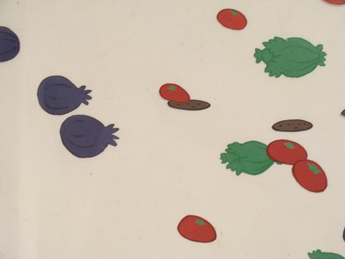 To create production cels, the original animator's drawing is transferred onto an acetate cel (by hand-inking and/or photo copying). The cel is then hand-painted on the reverse side. The cel is ready to be matted and framed. The animator's notations are at the top of the cel. The cel is multilayered: first is tomatoes and what looks like potatoes and then the onions and lettuce.