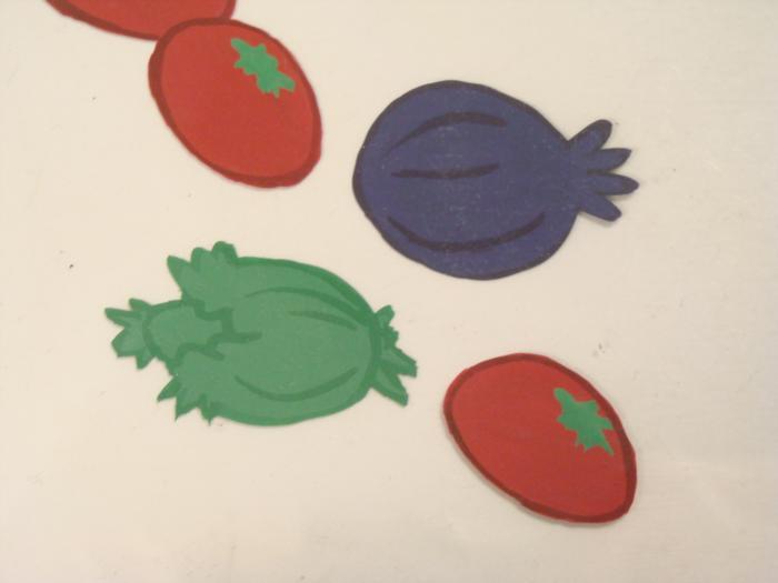 To create production cels, the original animator's drawing is transferred onto an acetate cel (by hand-inking and/or photo copying). The cel is then hand-painted on the reverse side. The cel is ready to be matted and framed. The animator's notations are at the top of the cel. The cel is multilayered: first is tomatoes and what looks like potatoes and then the onions and lettuce.