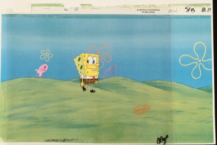 This animation cel and reproduction background are from the Nickelodeon TV show SpongeBob Squarepants. The story takes place under the deep blue sea in Bikini Bottom, where SpongeBob resides. SpongeBob, who is a yellow, porous sponge, is your typical happy-go-lucky character, as he is always cheerful and enjoys making people laugh. Patrick Star, SpongeBob's neighbor who is a starfish, is your average children's show idiot, as he boasts knowing nothing and is often getting himself into ridiculous situations. Between the homes of these two lies the home of the miserable Squidward, a squid, who is known for being grouchy and playing tricks on SpongeBob and Patrick. Both SpongeBob and Squidward work at the Krusty Krab, a fast food business run by the greedy money-loving Mr. Krabs, a crab, the arch rival of the evil, possibly misunderstood, Plankton. Another neighbor, Sandy Cheeks, an athletic squirrel who normally wears an astronaut's space suit, was introduced in "Tea at the Treedome." She spends most of her time inventing and experimenting. A jellyfish is following SpongeBob.Original Printed Background and Animated Cel Overall Size of Background: 11" x 17" Overall Size of the Cel: 10 1/2" x 12 1/2" Very good condition This is an original hand-painted cel set-up used in the production of an episode of "SpongeBob SquarePants." Each one-of-a-kind set-up represents a slight change in position of the characters. When individually photographed and projected in rapid succession, the images appear to move.