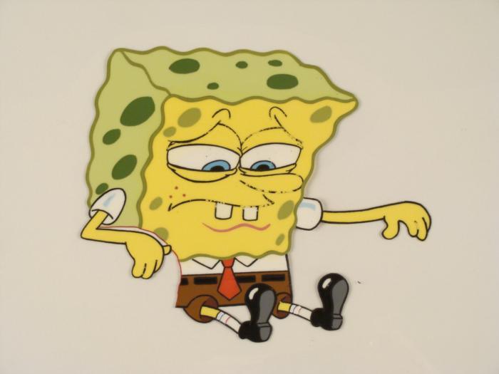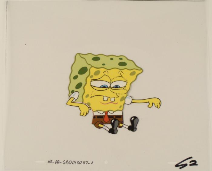 This original animation cel is from the Nickelodeon TV show SpongeBob Squarepants. The story takes place under the deep blue sea in Bikini Bottom, where SpongeBob resides. SpongeBob, who is a yellow, porous sponge, is your typical happy-go-lucky character, as he is always cheerful and enjoys making people laugh. Patrick Star, SpongeBob's neighbor who is a starfish, is your average children's show idiot, as he boasts knowing nothing and is often getting himself into ridiculous situations. Between the homes of these two lies the home of the miserable Squidward, a squid, who is known for being grouchy and playing tricks on SpongeBob and Patrick. Both SpongeBob and Squidward work at the Krusty Krab, a fast food business run by the greedy money-loving Mr. Krabs, a crab, the arch rival of the evil, possibly misunderstood, Plankton. Another neighbor, Sandy Cheeks, an athletic squirrel who normally wears an astronaut's space suit, was introduced in "Tea at the Treedome." She spends most of her time inventing and experimenting. SpongeBob looks troubled.Original Production Animated Cel Overall Size of Cel: 10 1/2" x 12 1/2" Very Good ConditionThis is an original hand-painted cel set-up used in the production of an episode of "SpongeBob SquarePants." Each one-of-a-kind set-up represents a slight change in position of the characters. When individually photographed and projected in rapid succession, the images appear to move.
