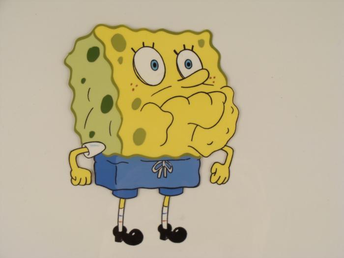 This original animation cel is from the Nickelodeon TV show SpongeBob Squarepants. The story takes place under the deep blue sea in Bikini Bottom, where SpongeBob resides. SpongeBob, who is a yellow, porous sponge, is your typical happy-go-lucky character, as he is always cheerful and enjoys making people laugh. Patrick Star, SpongeBob's neighbor who is a starfish, is your average children's show idiot, as he boasts knowing nothing and is often getting himself into ridiculous situations. Between the homes of these two lies the home of the miserable Squidward, a squid, who is known for being grouchy and playing tricks on SpongeBob and Patrick. Both SpongeBob and Squidward work at the Krusty Krab, a fast food business run by the greedy money-loving Mr. Krabs, a crab, the arch rival of the evil, possibly misunderstood, Plankton. Another neighbor, Sandy Cheeks, an athletic squirrel who normally wears an astronaut's space suit, was introduced in "Tea at the Treedome." She spends most of her time inventing and experimenting. It appears that Spongebob misjudged the difficulty of holding his breath as long as he can.Original Production Animated Cel Overall Size of Cel: 10 1/2" x 12 1/2" Excellent ConditionThis is an original hand-painted cel set-up used in the production of an episode of "SpongeBob SquarePants." Each one-of-a-kind set-up represents a slight change in position of the characters. When individually photographed and projected in rapid succession, the images appear to move.