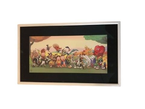 This colorful serigraph features classic Warner Bros. cartoon characters including Bugs Bunny, Daffy Duck, Porky Pig, Elmer Fudd, Sylvester the Cat, Yosemite Sam, Tweety Bird, and Marvin the Martian. Limited edition print by Animation Art “Warner Bros. Gang" Serio lithograph of 10,000 made.