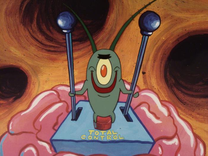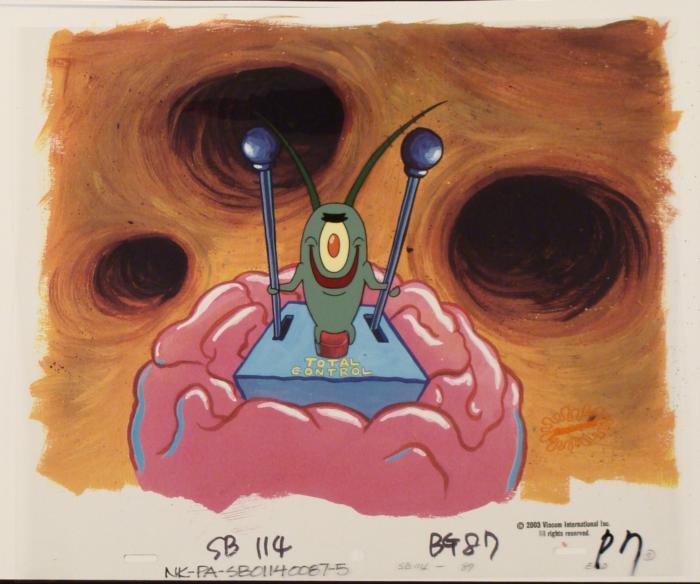 This animation cel and reproduction background are from the Nickelodeon TV show SpongeBob Squarepants. The story takes place under the deep blue sea in Bikini Bottom, where SpongeBob resides. SpongeBob, who is a yellow, porous sponge, is your typical happy-go-lucky character, as he is always cheerful and enjoys making people laugh. Patrick Star, SpongeBob's neighbor who is a starfish, is your average children's show idiot, as he boasts knowing nothing and is often getting himself into ridiculous situations. Between the homes of these two lies the home of the miserable Squidward, a squid, who is known for being grouchy and playing tricks on SpongeBob and Patrick. Both SpongeBob and Squidward work at the Krusty Krab, a fast food business run by the greedy money-loving Mr. Krabs, a crab, the arch rival of the evil, possibly misunderstood, Plankton. Another neighbor, Sandy Cheeks, an athletic squirrel who normally wears an astronaut's space suit, was introduced in "Tea at the Treedome." She spends most of her time inventing and experimenting. Plankton has full control of SpongeBob.Original Printed Background and Animated Cel Overall Size of Background: 11" x 17" Overall Size of the Cel: 10 1/2" x 12 1/2" Very good condition This is an original hand-painted cel set-up used in the production of an episode of "SpongeBob SquarePants." Each one-of-a-kind set-up represents a slight change in position of the characters. When individually photographed and projected in rapid succession, the images appear to move.