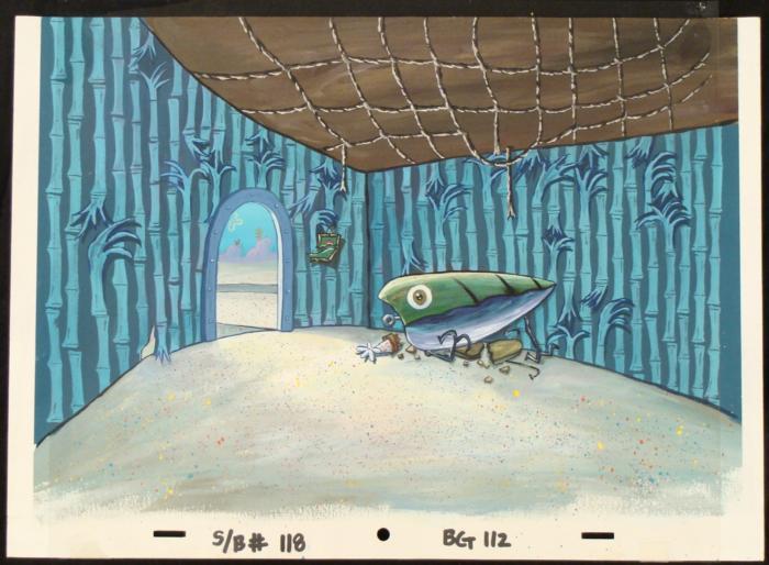 This original hand-painted background from the Nickelodeon TV show SpongeBob Squarepants. The story takes place under the deep blue sea in Bikini Bottom, where SpongeBob resides. SpongeBob, who is a yellow, porous sponge, is your typical happy-go-lucky character, as he is always cheerful and enjoys making people laugh. Patrick Star, SpongeBob's neighbor who is a starfish, is your average children's show idiot, as he boasts knowing nothing and is often getting himself into ridiculous situations. Between the homes of these two lies the home of the miserable Squidward, a squid, who is known for being grouchy and playing tricks on SpongeBob and Patrick. Both SpongeBob and Squidward work at the Krusty Krab, a fast food business run by the greedy money-loving Mr. Krabs, a crab, the arch rival of the evil, possibly misunderstood, Plankton. Another neighbor, Sandy Cheeks, an athletic squirrel who normally wears an astronaut's space suit, was introduced in "Tea at the Treedome." She spends most of her time inventing and experimenting. SpongeBob's house is falling apartOriginal Production Background Overall Size of Background: 10" x 14" Very good conditionOriginal Production Backgrounds are used in the making of the final version of animated productions. The background establishes the location and the overall good mood of the scenee. Typically, a background layout artist creates a drawing to establish the content of the scene, placement of characters, perspective and camera angle. Based on this drawing, the background artist creates a preliminary painting to confirm all of the scenes details, then the final production background which is used in the filming of the scene. When these backgrounds are individually photographed behind the progression of production cels, and projected at a rapid succession, the images in the foreground appear to move, creating an animated scene. The background is ready to be matted and framed. It is a colored background with the animator's notations at the bottom. There is a protective over-layer cel over the background.
