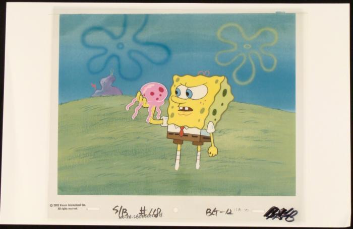 This animation cel and reproduction background are from the Nickelodeon TV show SpongeBob Squarepants. The story takes place under the deep blue sea in Bikini Bottom, where SpongeBob resides. SpongeBob, who is a yellow, porous sponge, is your typical happy-go-lucky character, as he is always cheerful and enjoys making people laugh. Patrick Star, SpongeBob's neighbor who is a starfish, is your average children's show idiot, as he boasts knowing nothing and is often getting himself into ridiculous situations. Between the homes of these two lies the home of the miserable Squidward, a squid, who is known for being grouchy and playing tricks on SpongeBob and Patrick. Both SpongeBob and Squidward work at the Krusty Krab, a fast food business run by the greedy money-loving Mr. Krabs, a crab, the arch rival of the evil, possibly misunderstood, Plankton. Another neighbor, Sandy Cheeks, an athletic squirrel who normally wears an astronaut's space suit, was introduced in "Tea at the Treedome." She spends most of her time inventing and experimenting. SpongeBob is angry at the jellyfish.Original Printed Background and Animated Cel Overall Size of Background: 11" x 17" Overall Size of the Cel: 10 1/2" x 12 1/2" Very good condition This is an original hand-painted cel set-up used in the production of an episode of "SpongeBob SquarePants." Each one-of-a-kind set-up represents a slight change in position of the characters. When individually photographed and projected in rapid succession, the images appear to move.