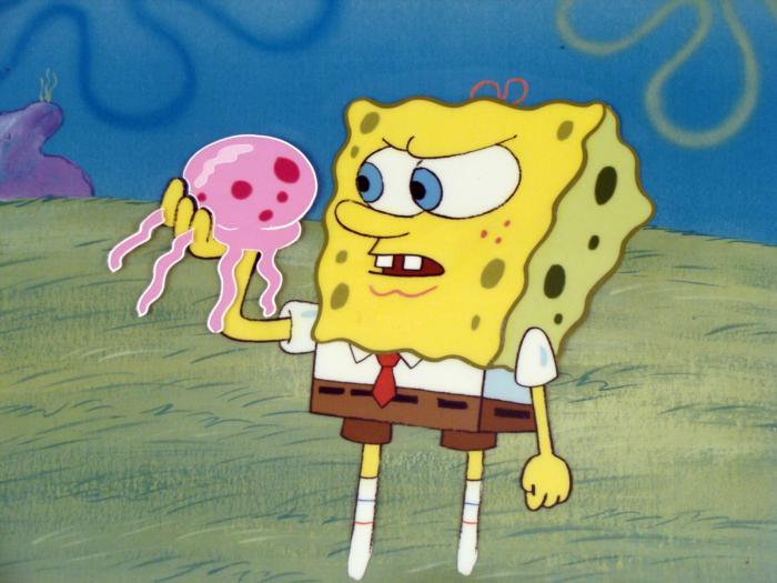 This animation cel and reproduction background are from the Nickelodeon TV show SpongeBob Squarepants. The story takes place under the deep blue sea in Bikini Bottom, where SpongeBob resides. SpongeBob, who is a yellow, porous sponge, is your typical happy-go-lucky character, as he is always cheerful and enjoys making people laugh. Patrick Star, SpongeBob's neighbor who is a starfish, is your average children's show idiot, as he boasts knowing nothing and is often getting himself into ridiculous situations. Between the homes of these two lies the home of the miserable Squidward, a squid, who is known for being grouchy and playing tricks on SpongeBob and Patrick. Both SpongeBob and Squidward work at the Krusty Krab, a fast food business run by the greedy money-loving Mr. Krabs, a crab, the arch rival of the evil, possibly misunderstood, Plankton. Another neighbor, Sandy Cheeks, an athletic squirrel who normally wears an astronaut's space suit, was introduced in "Tea at the Treedome." She spends most of her time inventing and experimenting. SpongeBob is angry at the jellyfish.Original Printed Background and Animated Cel Overall Size of Background: 11" x 17" Overall Size of the Cel: 10 1/2" x 12 1/2" Very good condition This is an original hand-painted cel set-up used in the production of an episode of "SpongeBob SquarePants." Each one-of-a-kind set-up represents a slight change in position of the characters. When individually photographed and projected in rapid succession, the images appear to move.