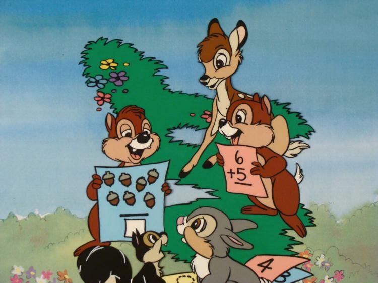 Bambi and his friends are excited to learn some math * * * Printed Background and Animated CelMedium: Hand painted acetate celDetails: Numbers and peg holes * * Size of Cel: 10 1/2 x 12 1/2 inchesSize of Background: 11 x 17 inches * * Condition: Very Good * This is an original hand-painted cel set-up used in the production of "Bambi." Each one-of-a-kind set-up represents a slight change in position of the characters. When individually photographed and projected in rapid succession, the images appear to move. * * To create production cels, the original animator's drawing is transferred onto an acetate cel (by hand-inking and/or photo copying). The cel is then hand-painted on the reverse side. The background accompanying this set-up is a printed reproduction background * * *