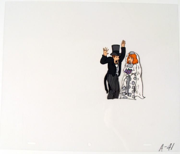 This is an original animation cel of a bride and groom. * * * * He is in-sane... Absolutely in-sane!! * * * Medium: Hand painted acetate cel * * Cel size: 10 1/2" x 12 1/2" * * Notations: Bottom of cel * * Condition: Excellent