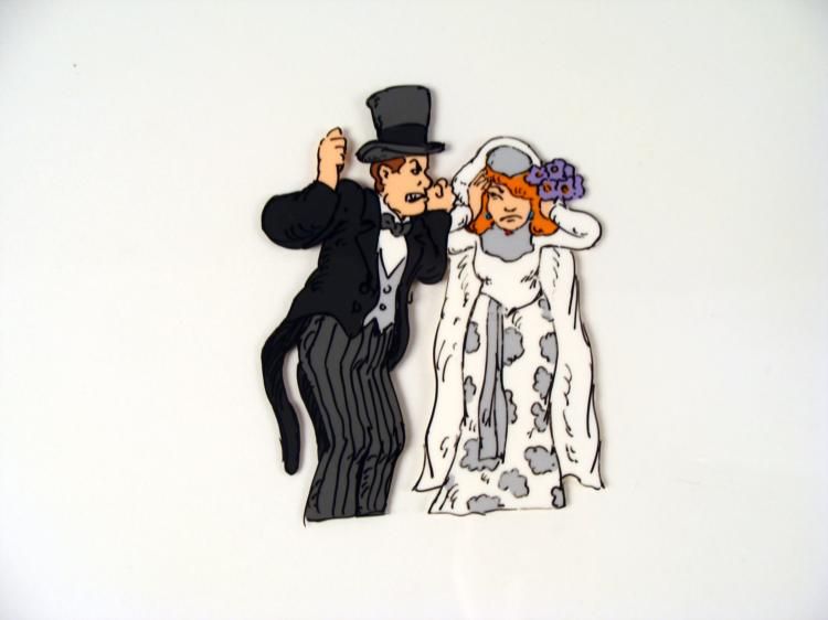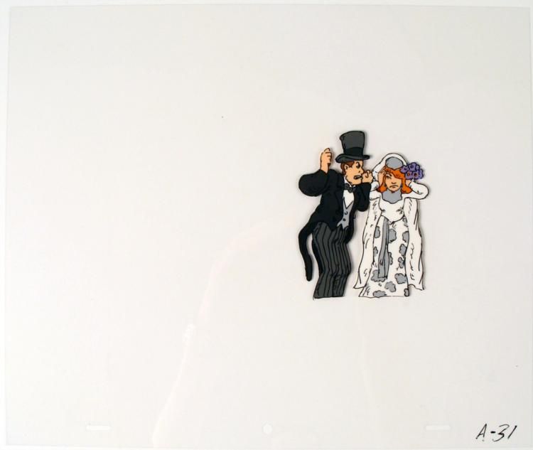 This is an original animation cel of a bride and groom. * * * * What is wrong with you?!? * * * Medium: Hand painted acetate cel * * Cel size: 10 1/2" x 12 1/2" * * Notations: Bottom of cel * * Condition: Excellent