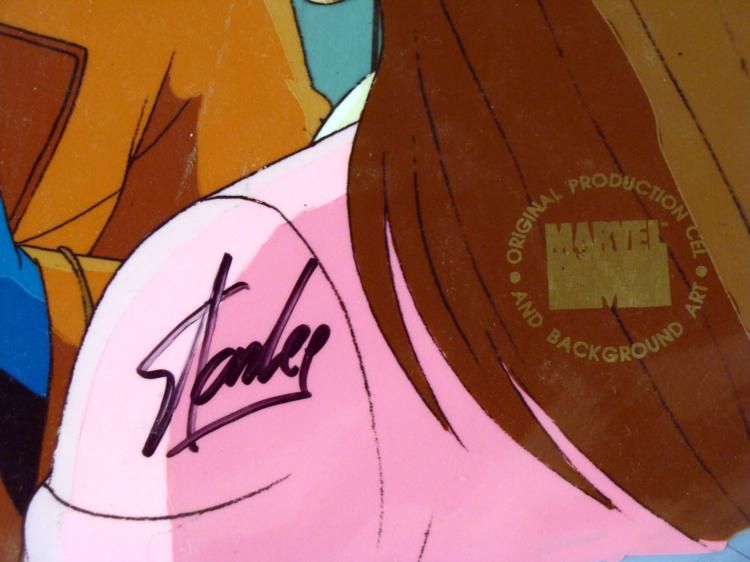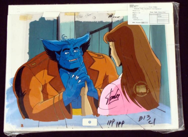 This is an original signed production cel and background from the hit series X-Men. Stan Lee signature is located on the right of cel in black sharpie. * Under a cloud of increasing anti-mutant sentiment, Professor Xavier creates a haven at his Westchester mansion to train young mutants to use their powers for the benefit of humanity, and to prove mutants can be heroes. Xavier recruited Cyclops, Iceman, Angel, Beast and Jean Grey calling them "X-Men" because they possessed the "x-gene", an ability normal humans lacked. Early issues introduced the team's arch enemy, Magneto and his Brotherhood of Evil Mutants, who would later battle the X-Men for years. * I guess this is Beast's female friend * * Original Animated Cel & Production BackgroundMedium: Hand painted acetate celDetails: Animation notations and peg holes * Overall Size of the Cel: 10 1/2" x 12 1/2" Overall Size of the background: 10 1/4" x 15" Excellent Condition This is an original hand-painted cel set-up used in the production of an episode of X-Men titled "Beauty and the Beast." Each one-of-a-kind set-up represents a slight change in position of the characters. When individually photographed and projected in rapid succession, the images appear to move. * To create production cels, the original animator's drawing is transferred onto an acetate cel (by hand-inking and/or photo copying). The cel is then hand-painted on the reverse side. The background accompanying this set-up is an original production background. * The cel and original background is ready to be matted and framed. The animators notations are located at the bottom of the cel and background. A Certificate of Authenticity from Marvel is on the back of background. The Marvel Seal is located at the top right of the cel. The cel and background are in a protective sleeve. An information card about the episode is located at the top right of the protective sleeve. *