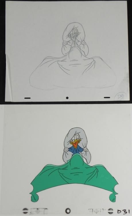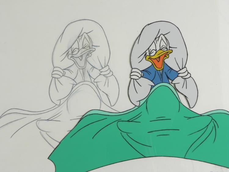 Donald Fauntleroy Duck is a cartoon character created in 1934 at Walt * Disney Productions. Donald is an anthropomorphic white duck with a * yellow-orange bill, legs, and feet. He typically wears a sailor suit * with a cap and a black or red bow tie. Donald * is most famous for his semi-intelligible speech and his mischievous and * irritable personality. Along with his friend Mickey Mouse, Donald is * one of the most popular Disney characters and was included in TV Guide's * list of the 50 greatest cartoon characters * of all time in 2002. * * I swear, if those kids do not turn down that volume, they are not going to like what's coming to them... * Original Animation Cel and * DrawingOriginal "rough" drawing in black and * non-photo blue pencil with the notations in non-photo * blueOverall size is a 12-field drawing that is 10 * 1/2" x 12 1/2"Size of cel: 10 1/2" x 12 * 1/2"Overall condition: * Cel- Excellent and Drawing- Very good; minor fold to lower left corner * This is * an original hand-painted cel used in * the production of an episode of "Donald Duck." Each cel represents a * slight change in position of the characters. When individually * photographed and projected in rapid succession, the images * appear to move. To * create production cels, the original animator's drawing is transferred * onto an acetate cel (by hand-inking and/or photo copying). The cel is * then hand-painted on the reverse side. * * * * The drawing and cel are ready to be matted and * framed. The notations are located at the bottom of * both.