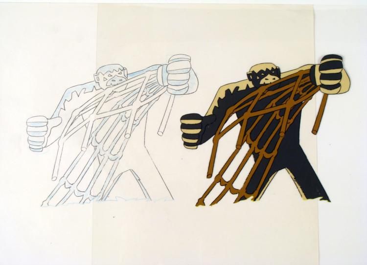 The Herculoids battled to defend their planet from menaces on Amzot/Quasar and from outer space. All of the Herculoids displayed Human-level intelligence - employing precision teamwork and complex tactics - as well as emotions, and Zandor and Tara both * displayed a working knowledge of complex alien technologies as well as the ability to pilot interstellar spacecraft—but essentially, Zandor, Tara, Dorno, and the Herculoids were fighting to keep Amzot/Quasar a technology-free, primitive planet. This is further * indicated by the pseudo-barbarian outfits of Zandor, Tara, and Dorno and the fact that technology was used mainly by the various villains, but rarely if ever by the heroes. Although the "speech" of their companions was limited and repetitive, Zandor, Tara * and Dorno demonstrated that Gloop and Gleep, at least, had a comprehensive mode of communication, and that they could at least understand and interpret this language. * * * * **The cel and drawing are at least 35 years old. * * * * HA!! You think this rope will keep me cage forever? I'll show you... * * * Original Animation and Drawing * * Original "rough" animation drawing, in non-photo blue and black pencil with the notations in black. * * * Overall Size of Drawing: 10 1/2" x 12 1/2" * Overall Size of the Cel: 10 1/2" x 12 1/2" * Excellent condition * This is an original hand-painted cel set-up used in the production of an episode of "Herculoids." Each one-of-a-kind set-up represents a slight change in position of the characters. When individually photographed and projected in rapid succession, the images * appear to move. * * To create production cels, the original animator's drawing is transferred onto an acetate cel (by hand-inking and/or photo copying). The cel is then hand-painted on the reverse side. * * * * * The drawing and cel are ready to be matted and framed. The notations are located at the bottom of the drawing and cel. * *