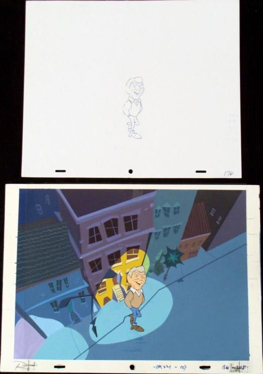 Mervyn Edward "Merv" Griffin, Jr. was an American television host, musician, actor, and media mogul. He began his career as a radio and big band singer who went on to appear in movies and on Broadway. * * Original Animation Cel & Production Background & Drawing * * Medium: Hand painted acetate celDetails: Animation notations and peg holes * * Size of background: 10 1/2 x 14 inches Size of drawing: 10 1/2 x 12 1/2 inches * * Size of cel: 10 1/2 x 12 1/2 inchesCondition: Very good * This is an original hand-painted cel set-up. Each one-of-a-kind set-up represents a slight change in position of the characters. When individually photographed and projected in rapid succession, the images appear to move. To created production cels, the original * animator's drawing is transferred onto an acetate cel (by hand-inking and/or photo copying). The cel is then hand-painted on the reverse side. The background accompanying this cel is an original hand-painted background. * * Traditional animation is a multi-step process which includes various types of art techniques. Drawings are a key part of the process, in which the animator creates the design and movement of the characters. Drawings are then transferred onto acetate cels * (by hand-inking and/or photo copying) to create a production cel, which is then hand painted on the back side, using paint colors chosen and approved by the creator of the series. * * * *