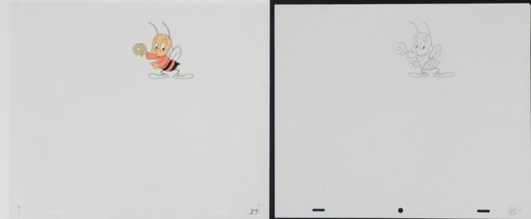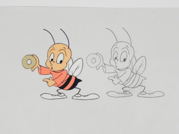 Here, Buzz is showing everyone his impressive cheerio. This original animation cel & drawing are from the production of the Cheerios cereal commercial. * Original Animation Cel & DrawingMedium: Hand painted acetate celDetails: Animation notations