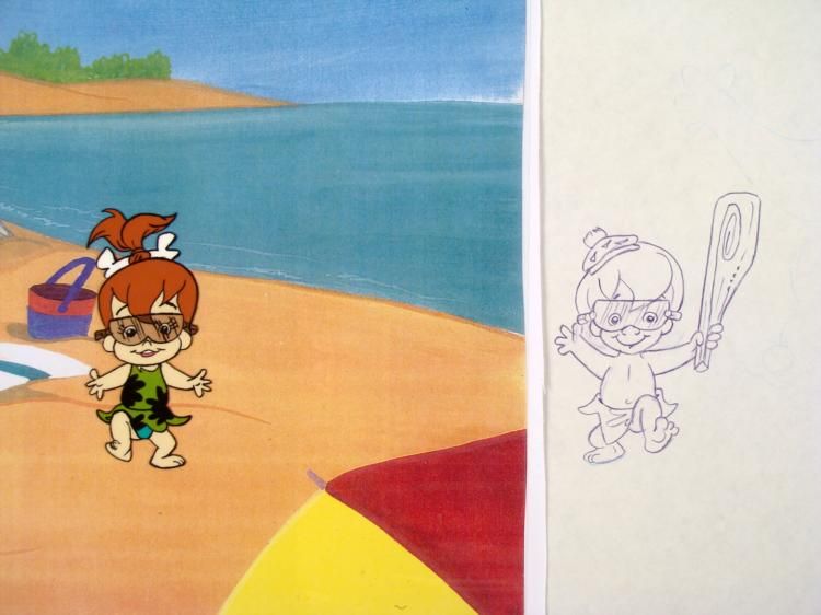 Aren't they so cute?? The cel comes with a matching drawing overlay. * * Original Production Art Cel, Drawing, and Reproduction Background Original "rough" animation drawing, with notations in black. Bam Bam has been outlined in purple and Pebbles has been outlined in purple and non-photo blue. * Overall Size of the Cel: 10 1/2" x 12 1/2" Overall Size of Reproduction Background: 11" x 13 1/4" * Excellent condition This is an original hand-painted cel set-up used in the production of an episode of "The Flintstones." Each one-of-a-kind set-up represents a slight change in position of the characters. When individually photographed and projected in rapid succession, the images appear to move. * To create production cels, the original animator's drawing is transferred onto an acetate cel (by hand-inking and/or photo copying). The cel is then hand-painted on the reverse side. The background accompanying this set-up is a reproduction background. * * The cel, drawing, and background are ready to be matted and framed. The animator's notations are shown at the bottom of the cel and drawing.