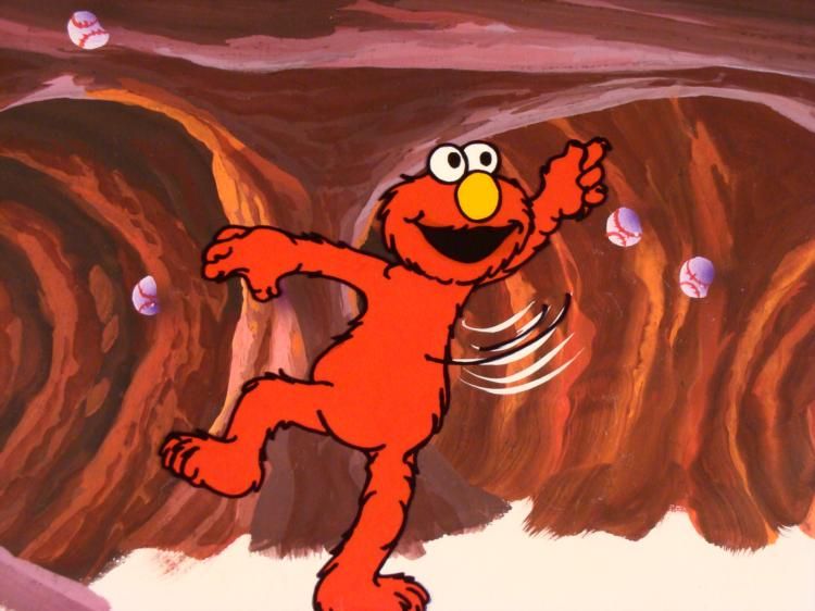 In Elmo's world everyone is happy and full of laughter. Elmo enjoys making friends and having a good time. In the cel, Elmo is in a cave full of baseballs * * * Original Animation Cel & Production Background * * Medium: Hand painted acetate celDetails: Animation notations and peg holes * * Size of cel: 10 1/2 x 12 1/2 inchesSize of background: 10 1/2 x 14 1/4 inches * * Condition: Very good * * * This is an original hand-painted cel set-up used in the production of an episode of "Sesame Street." Each one-of-a-kind set-up represents a slight change in position of the characters. When individually photographed and projected in rapid succession, the * images appear to move. * * To create production cels, the original animator's drawing is transferred onto an acetate cel (by hand-inking and/or photo copying). The cel is then hand-painted on the reverse side. The background accompanying this set-up is a original hand-painted background. * *