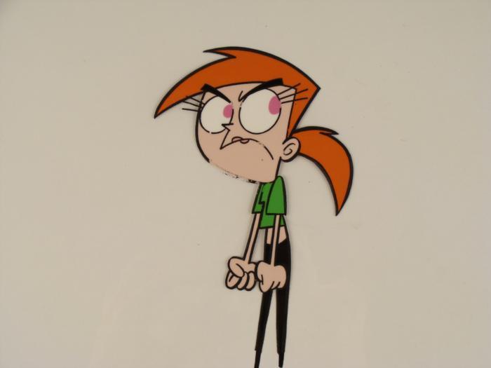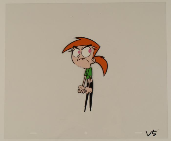 This original animation cel is from the Nickelodeon TV show Fairly Odd Parents. Timmy Turner is a short, buck-toothed 10-year-old boy with a pink cap who lives in Dimmsdale, a small suburban town with his dim-witted parents. His life is constantly miserable, due to the fact that his parents are rarely home and he is babysat by an incredibly evil teenager, Vicky, and that, generally, no one understands him (as indicated by the show's theme song). But everything changes when he receives two fairy parents: Cosmo and his wife, Wanda and later, their son Poof. Timmy learns that his fairy godparents are capable of granting him any wish he wants within certain limits. However, Timmy's immature nature causes him to sometimes ask for wishes that unintentionally result in disaster, and he and his fairy parents and fairy brother must find a way to "unwish" the wish. Vicky looks pretty pissed off at something or someone. Original Production Animated Cel Overall Size of Cel: 10 1/2" x 12 1/2" Very Good ConditionThis is an original hand-painted cel set-up used in the production of an episode of "Fairly Odd Parents." Each one-of-a-kind set-up represents a slight change in position of the characters. When individually photographed and projected in rapid succession, the images appear to move.