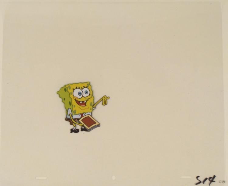 This original animation cel is from the Nickelodeon TV show SpongeBob Squarepants. The story takes place under the deep blue sea in Bikini Bottom, where SpongeBob resides. SpongeBob, who is a yellow, porous sponge, is your typical happy-go-lucky character, as he is always cheerful and enjoys making people laugh. Patrick Star, SpongeBob's neighbor who is a starfish, is your average children's show idiot, as he boasts knowing nothing and is often getting himself into ridiculous situations. Between the homes of these two lies the home of the miserable Squidward, a squid, who is known for being grouchy and playing tricks on SpongeBob and Patrick. Both SpongeBob and Squidward work at the Krusty Krab, a fast food business run by the greedy money-loving Mr. Krabs, a crab, the arch rival of the evil, possibly misunderstood, Plankton. Another neighbor, Sandy Cheeks, an athletic squirrel who normally wears an astronaut's space suit, was introduced in "Tea at the Treedome." She spends most of her time inventing and experimenting. * See kids, reading is knowledge and knowledge is power, remember that... * Original Production Animated Cel Overall Size of Cel: 10 1/2" x 12 1/2" Very Good Condition This is an original hand-painted cel set-up used in the production of an episode of "SpongeBob SquarePants." Each one-of-a-kind set-up represents a slight change in position of the characters. When individually photographed and projected in rapid succession, the images appear to move. * To create production cels, the original animator's drawing is transferred onto an acetate cel (by hand-inking and/or photo copying). The cel is then hand-painted on the reverse side. * The cel received by the winning bidder may be ever so slightly different from the one in the auction photos. * The cel is ready to be matted and framed. The animator's notations are at the bottom of the cel. There is some slight paint fade to Spongebob's outline. *