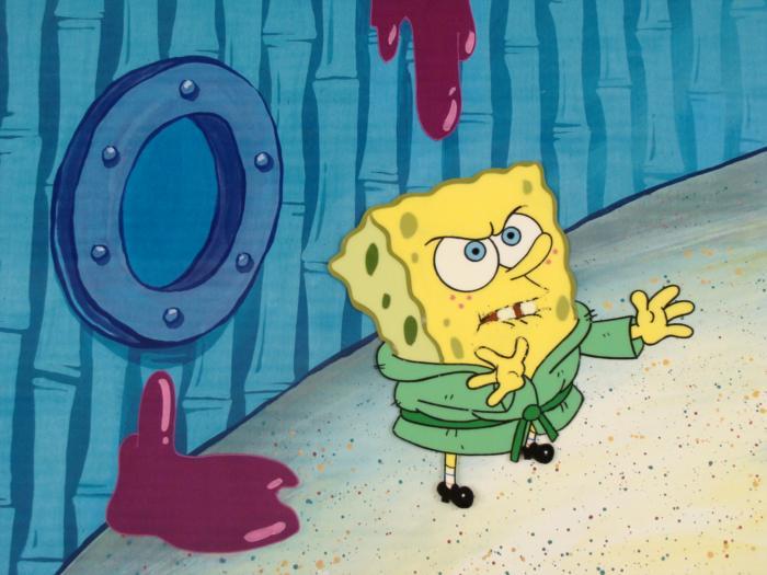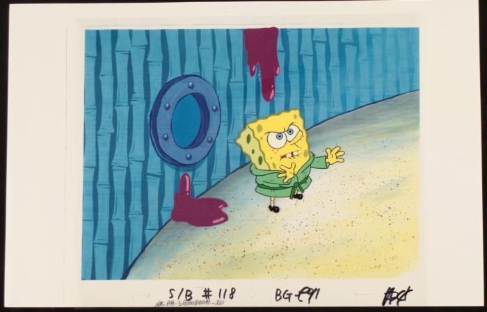 This animation cel and reproduction background are from the Nickelodeon TV show SpongeBob Squarepants. The story takes place under the deep blue sea in Bikini Bottom, where SpongeBob resides. SpongeBob, who is a yellow, porous sponge, is your typical happy-go-lucky character, as he is always cheerful and enjoys making people laugh. Patrick Star, SpongeBob's neighbor who is a starfish, is your average children's show idiot, as he boasts knowing nothing and is often getting himself into ridiculous situations. Between the homes of these two lies the home of the miserable Squidward, a squid, who is known for being grouchy and playing tricks on SpongeBob and Patrick. Both SpongeBob and Squidward work at the Krusty Krab, a fast food business run by the greedy money-loving Mr. Krabs, a crab, the arch rival of the evil, possibly misunderstood, Plankton. Another neighbor, Sandy Cheeks, an athletic squirrel who normally wears an astronaut's space suit, was introduced in "Tea at the Treedome." She spends most of her time inventing and experimenting. It appears SpongeBob is pushing something.Original Printed Background and Animated Cel Overall Size of Background: 11" x 17" Overall Size of the Cel: 10 1/2" x 12 1/2" Very good condition This is an original hand-painted cel set-up used in the production of an episode of "SpongeBob SquarePants." Each one-of-a-kind set-up represents a slight change in position of the characters. When individually photographed and projected in rapid succession, the images appear to move.
