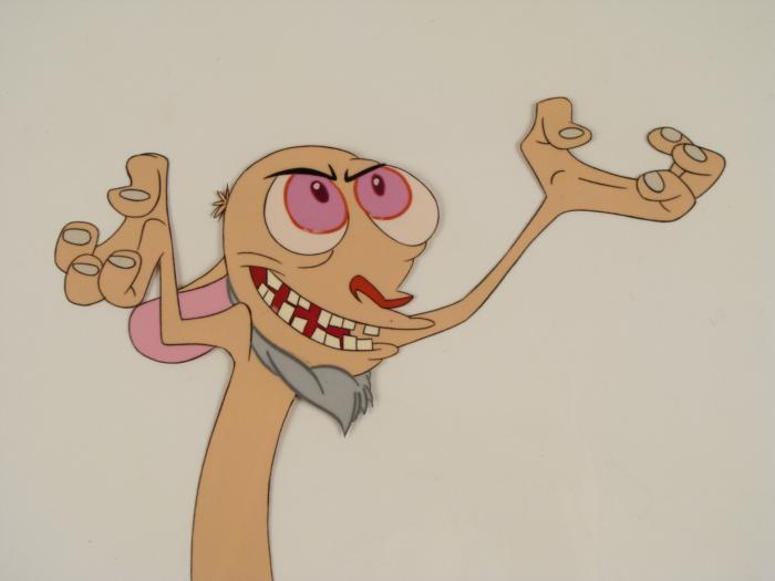 This is an original production animation cel from the Nickelodeon TV show Ren & Stimpy. The show follows two characters - Ren, a crazy Chihuahua - and - Stimpy, an incredibly stupid cat - as they think up to all kinds of hair brained schemes and get themselves into some sticky situations. The Ren and Stimpy Show debuted in August 1991 with a two-part episode, 'Stimpy's Big Day / The Big Shot' and became an instant hit. It was the third Nicktoon ever to be aired on the Network alongside Doug and Rugrats. Ren is a genius Original Production Art Cel Overall Size of the Cel: 10 1/2" x 12 1/2" Very Good condition This is an original hand-painted cel set-up used in the production of an episode of "The Ren & Stimpy Show." Each one-of-a-kind set-up represents a slight change in position of the characters. When individually photographed and projected in rapid succession, the images appear to move.