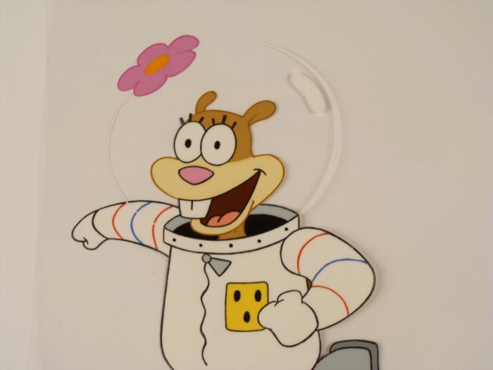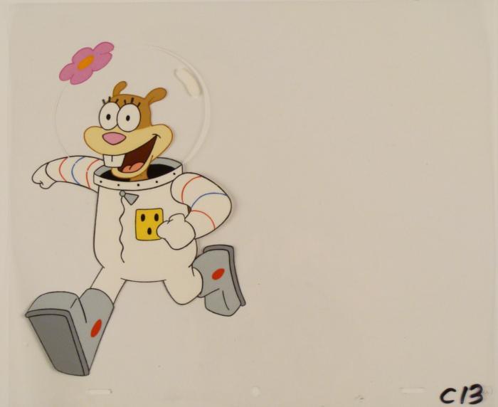 This original animation cel is from the Nickelodeon TV show SpongeBob Squarepants. The story takes place under the deep blue sea in Bikini Bottom, where SpongeBob resides. SpongeBob, who is a yellow, porous sponge, is your typical happy-go-lucky character, as he is always cheerful and enjoys making people laugh. Patrick Star, SpongeBob's neighbor who is a starfish, is your average children's show idiot, as he boasts knowing nothing and is often getting himself into ridiculous situations. Between the homes of these two lies the home of the miserable Squidward, a squid, who is known for being grouchy and playing tricks on SpongeBob and Patrick. Both SpongeBob and Squidward work at the Krusty Krab, a fast food business run by the greedy money-loving Mr. Krabs, a crab, the arch rival of the evil, possibly misunderstood, Plankton. Another neighbor, Sandy Cheeks, an athletic squirrel who normally wears an astronaut's space suit, was introduced in "Tea at the Treedome." She spends most of her time inventing and experimenting. Run Sandy, RUN!!! Original Production Animated Cel Overall Size of Cel: 10 1/2" x 12 1/2" Excellent ConditionThis is an original hand-painted cel set-up used in the production of an episode of "SpongeBob SquarePants." Each one-of-a-kind set-up represents a slight change in position of the characters. When individually photographed and projected in rapid succession, the images appear to move.
