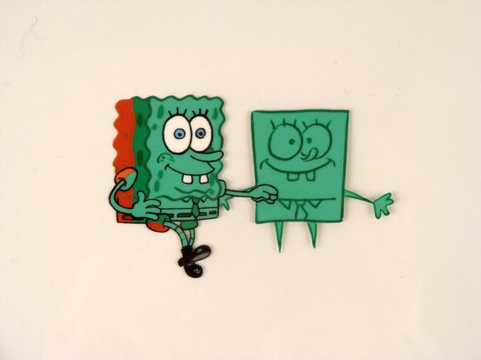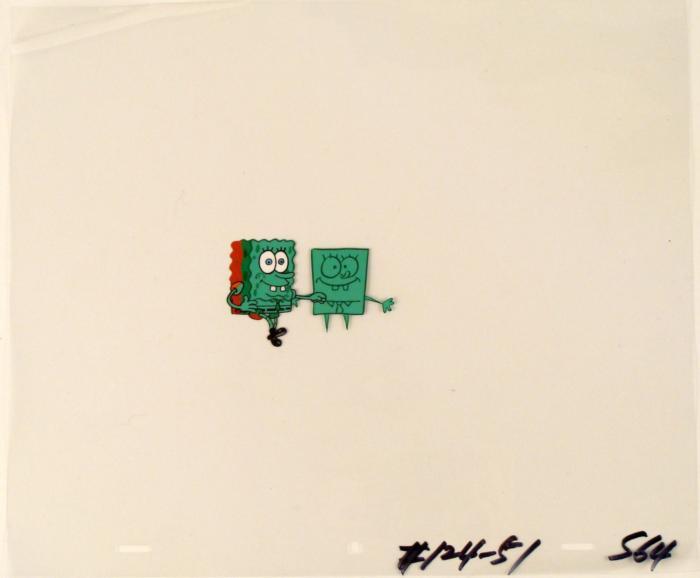 This original animation cel is from the Nickelodeon TV show SpongeBob Squarepants. The story takes place under the deep blue sea in Bikini Bottom, where SpongeBob resides. SpongeBob, who is a yellow, porous sponge, is your typical happy-go-lucky character, as he is always cheerful and enjoys making people laugh. Patrick Star, SpongeBob's neighbor who is a starfish, is your average children's show idiot, as he boasts knowing nothing and is often getting himself into ridiculous situations. Between the homes of these two lies the home of the miserable Squidward, a squid, who is known for being grouchy and playing tricks on SpongeBob and Patrick. Both SpongeBob and Squidward work at the Krusty Krab, a fast food business run by the greedy money-loving Mr. Krabs, a crab, the arch rival of the evil, possibly misunderstood, Plankton. Another neighbor, Sandy Cheeks, an athletic squirrel who normally wears an astronaut's space suit, was introduced in "Tea at the Treedome." She spends most of her time inventing and experimenting. Spongbob seems to have changed colors.Original Production Animated Cel Overall Size of Cel: 10 1/2" x 12 1/2" Excellent ConditionThis is an original hand-painted cel set-up used in the production of an episode of "SpongeBob SquarePants." Each one-of-a-kind set-up represents a slight change in position of the characters. When individually photographed and projected in rapid succession, the images appear to move.