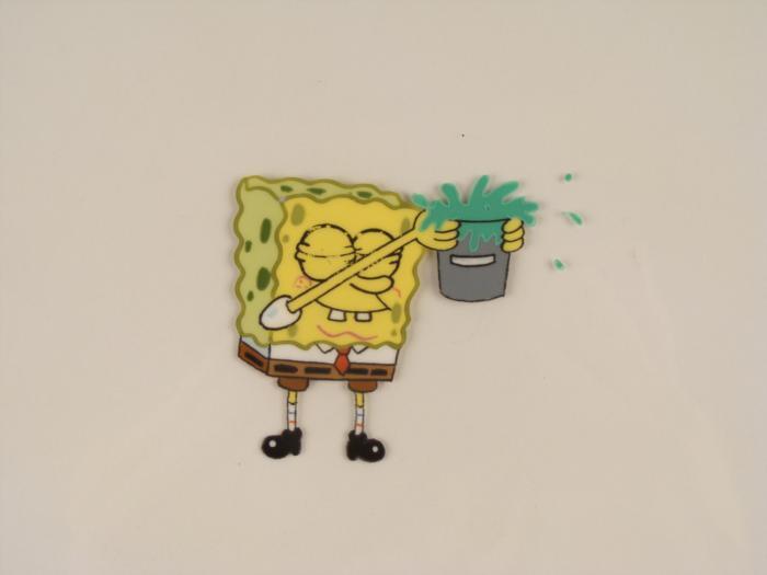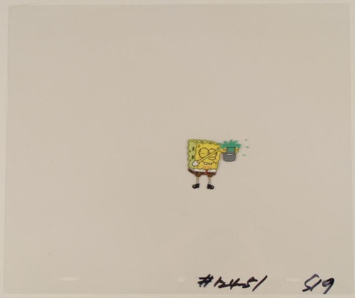 This original animation cel is from the Nickelodeon TV show SpongeBob Squarepants. The story takes place under the deep blue sea in Bikini Bottom, where SpongeBob resides. SpongeBob, who is a yellow, porous sponge, is your typical happy-go-lucky character, as he is always cheerful and enjoys making people laugh. Patrick Star, SpongeBob's neighbor who is a starfish, is your average children's show idiot, as he boasts knowing nothing and is often getting himself into ridiculous situations. Between the homes of these two lies the home of the miserable Squidward, a squid, who is known for being grouchy and playing tricks on SpongeBob and Patrick. Both SpongeBob and Squidward work at the Krusty Krab, a fast food business run by the greedy money-loving Mr. Krabs, a crab, the arch rival of the evil, possibly misunderstood, Plankton. Another neighbor, Sandy Cheeks, an athletic squirrel who normally wears an astronaut's space suit, was introduced in "Tea at the Treedome." She spends most of her time inventing and experimenting. Why is Spongebob holding green paint?Original Production Animated Cel Overall Size of Cel: 10 1/2" x 12 1/2" Very Good ConditionThis is an original hand-painted cel set-up used in the production of an episode of "SpongeBob SquarePants." Each one-of-a-kind set-up represents a slight change in position of the characters. When individually photographed and projected in rapid succession, the images appear to move.