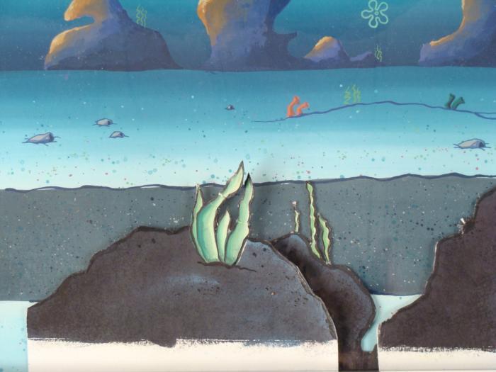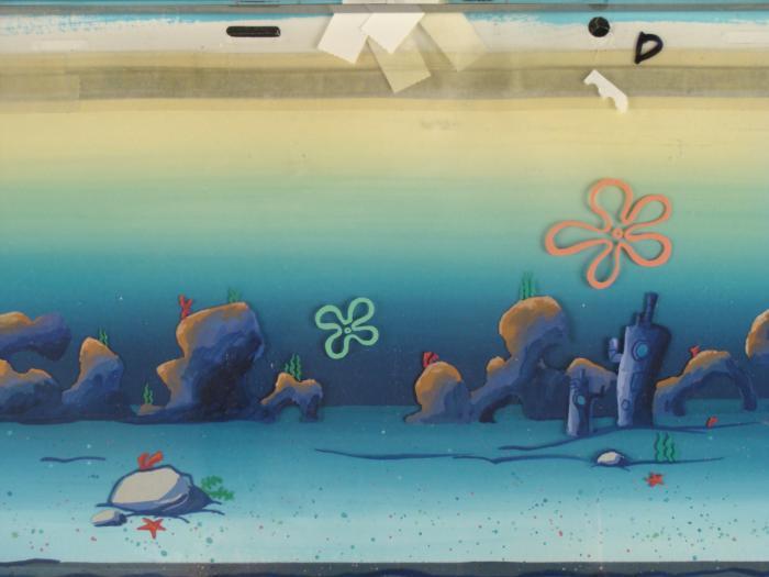 This original hand-painted background and animation cel is from the Nickelodeon TV show SpongeBob Squarepants. The story takes place under the deep blue sea in Bikini Bottom, where SpongeBob resides. SpongeBob, who is a yellow, porous sponge, is your typical happy-go-lucky character, as he is always cheerful and enjoys making people laugh. Patrick Star, SpongeBob's neighbor who is a starfish, is your average children's show idiot, as he boasts knowing nothing and is often getting himself into ridiculous situations. Between the homes of these two lies the home of the miserable Squidward, an octopus, who is known for being grouchy and playing tricks on SpongeBob and Patrick. Both SpongeBob and Squidward work at the Krusty Krab, a fast food business run by the greedy money-loving Mr. Krabs, a crab, the arch rival of the evil, possibly misunderstood, Plankton. Another neighbor, Sandy Cheeks, an athletic squirrel who normally wears an astronaut's space suit, was introduced in "Tea at the Treedome." She spends most of her time inventing and experimenting. This cel and background is a picture of Bikini Bottom.Original Production Background and Animated Cel Overall Size of Background: 9 1/2" x 16" Overall Size of Cel: 10 1/4" x 17 1/4" Very good condition; it has been stored rolledThis is an original hand-painted cel set-up used in the production of an episode of "SpongeBob SquarePants." Each one-of-a-kind set-up represents a slight change in position of the characters. When individually photographed and projected in rapid succession, the images appear to move.