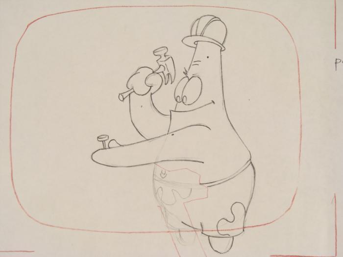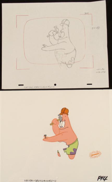 This original animation cel is from the Nickelodeon TV show SpongeBob Squarepants. The story takes place under the deep blue sea in Bikini Bottom, where SpongeBob resides. SpongeBob, who is a yellow, porous sponge, is your typical happy-go-lucky character, as he is always cheerful and enjoys making people laugh. Patrick Star, SpongeBob's neighbor who is a starfish, is your average children's show idiot, as he boasts knowing nothing and is often getting himself into ridiculous situations. Between the homes of these two lies the home of the miserable Squidward, a squid, who is known for being grouchy and playing tricks on SpongeBob and Patrick. Both SpongeBob and Squidward work at the Krusty Krab, a fast food business run by the greedy money-loving Mr. Krabs, a crab, the arch rival of the evil, possibly misunderstood, Plankton. Another neighbor, Sandy Cheeks, an athletic squirrel who normally wears an astronaut's space suit, was introduced in "Tea at the Treedome." She spends most of her time inventing and experimenting. Patrick is doing construction work.Original Production Animated Cel and Drawing Original "rough" animation drawing, in black and red pencil, with notations in black. Overall Size of Drawing: 10 1/2" x 12 1/2" Overall Size of Cel: 10 1/2" x 12 1/2" Excellent ConditionThis is an original hand-painted cel set-up used in the production of an episode of "SpongeBob SquarePants." Each one-of-a-kind set-up represents a slight change in position of the characters. When individually photographed and projected in rapid succession, the images appear to move.