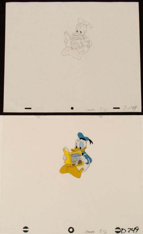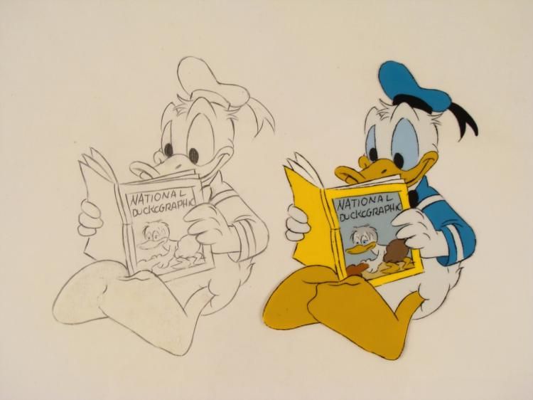 Donald Duck is reading the National Duckographic * * * * * Original Animation Cel & DrawingMedium: Hand painted acetate celDetails: Animation notations and peg holes * * Original "rough" animation drawing, in black pencil * * Size of cel: 10 1/2 x 12 1/2 inchesSize of drawing: 10 1/2 x 12 1/2 inches * * Condition: Very good * This is an original hand-painted cel set-up used in the production of the "Walt Disney Shows." Each one-of-a-kind set-up represents a slight change in position of the characters. When individually photographed and projected in rapid succession, the images appear * to move. To created production cels, the original animator's drawing is transferred onto an acetate cel (by hand-inking and/or photo copying). The cel is then hand-painted on the reverse side. * * * * * Traditional animation is a multi-step process which includes various types of art techniques. Drawings are a key part of the process, in which the animator creates the design and movement of the characters. Drawings are then transferred onto acetate cels * (by hand-inking and/or photo copying) to create a production cel, which is then hand painted on the back side, using paint colors chosen and approved by the creator of the series.