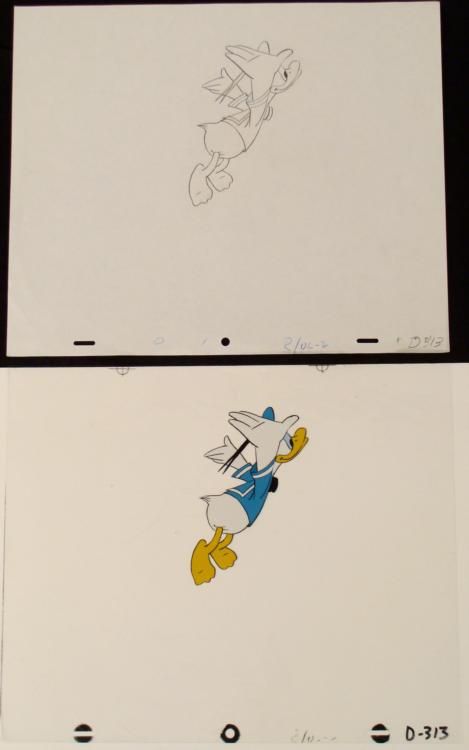 Can Donald Duck fly? * * * * * Original Animation Cel & DrawingMedium: Hand painted acetate celDetails: Animation notations and peg holes * * Original "rough" animation drawing, in non-photo blue and black pencil * * Size of cel: 10 1/