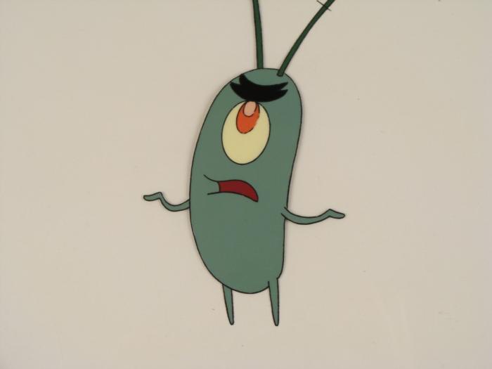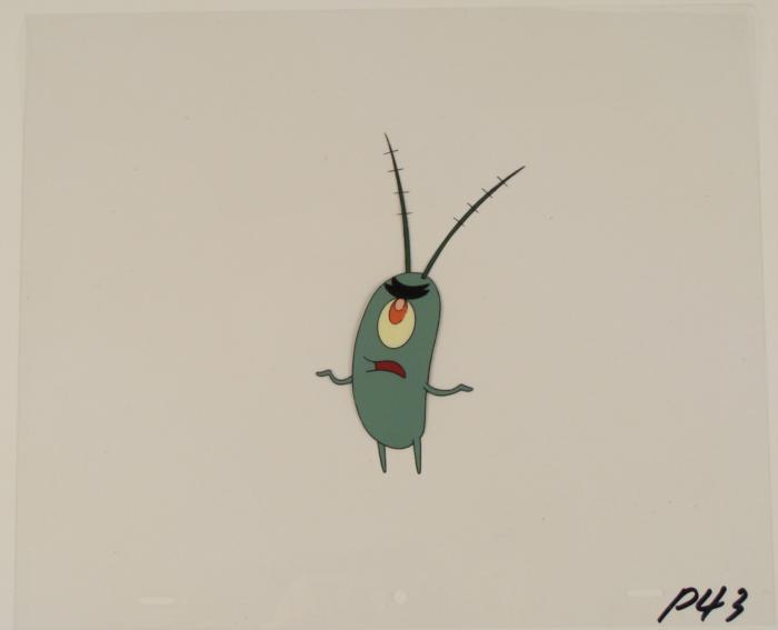 This original animation cel is from the Nickelodeon TV show SpongeBob Squarepants. The story takes place under the deep blue sea in Bikini Bottom, where SpongeBob resides. SpongeBob, who is a yellow, porous sponge, is your typical happy-go-lucky character, as he is always cheerful and enjoys making people laugh. Patrick Star, SpongeBob's neighbor who is a starfish, is your average children's show idiot, as he boasts knowing nothing and is often getting himself into ridiculous situations. Between the homes of these two lies the home of the miserable Squidward, a squid, who is known for being grouchy and playing tricks on SpongeBob and Patrick. Both SpongeBob and Squidward work at the Krusty Krab, a fast food business run by the greedy money-loving Mr. Krabs, a crab, the arch rival of the evil, possibly misunderstood, Plankton. Another neighbor, Sandy Cheeks, an athletic squirrel who normally wears an astronaut's space suit, was introduced in "Tea at the Treedome." She spends most of her time inventing and experimenting. What's your problem?Original Production Animated Cel Overall Size of Cel: 10 1/2" x 12 1/2" Excellent ConditionThis is an original hand-painted cel set-up used in the production of an episode of "SpongeBob SquarePants." Each one-of-a-kind set-up represents a slight change in position of the characters. When individually photographed and projected in rapid succession, the images appear to move.