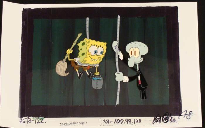 This animation cel and reproduction background are from the Nickelodeon TV show SpongeBob Squarepants. The story takes place under the deep blue sea in Bikini Bottom, where SpongeBob resides. SpongeBob, who is a yellow, porous sponge, is your typical happy-go-lucky character, as he is always cheerful and enjoys making people laugh. Patrick Star, SpongeBob's neighbor who is a starfish, is your average children's show idiot, as he boasts knowing nothing and is often getting himself into ridiculous situations. Between the homes of these two lies the home of the miserable Squidward, a squid, who is known for being grouchy and playing tricks on SpongeBob and Patrick. Both SpongeBob and Squidward work at the Krusty Krab, a fast food business run by the greedy money-loving Mr. Krabs, a crab, the arch rival of the evil, possibly misunderstood, Plankton. Another neighbor, Sandy Cheeks, an athletic squirrel who normally wears an astronaut's space suit, was introduced in "Tea at the Treedome." She spends most of her time inventing and experimenting. Why does SpongeBob trust Squidward to hold him up?Original Printed Background and Animated Cel Overall Size of Background: 11" x 17" Overall Size of the Cel: 10 1/2" x 12 1/2" Very good condition; it has been stored This is an original hand-painted cel set-up used in the production of an episode of "SpongeBob SquarePants." Each one-of-a-kind set-up represents a slight change in position of the characters. When individually photographed and projected in rapid succession, the images appear to move.
