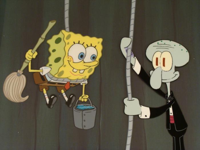This animation cel and reproduction background are from the Nickelodeon TV show SpongeBob Squarepants. The story takes place under the deep blue sea in Bikini Bottom, where SpongeBob resides. SpongeBob, who is a yellow, porous sponge, is your typical happy-go-lucky character, as he is always cheerful and enjoys making people laugh. Patrick Star, SpongeBob's neighbor who is a starfish, is your average children's show idiot, as he boasts knowing nothing and is often getting himself into ridiculous situations. Between the homes of these two lies the home of the miserable Squidward, a squid, who is known for being grouchy and playing tricks on SpongeBob and Patrick. Both SpongeBob and Squidward work at the Krusty Krab, a fast food business run by the greedy money-loving Mr. Krabs, a crab, the arch rival of the evil, possibly misunderstood, Plankton. Another neighbor, Sandy Cheeks, an athletic squirrel who normally wears an astronaut's space suit, was introduced in "Tea at the Treedome." She spends most of her time inventing and experimenting. Why does SpongeBob trust Squidward to hold him up?Original Printed Background and Animated Cel Overall Size of Background: 11" x 17" Overall Size of the Cel: 10 1/2" x 12 1/2" Very good condition; it has been stored This is an original hand-painted cel set-up used in the production of an episode of "SpongeBob SquarePants." Each one-of-a-kind set-up represents a slight change in position of the characters. When individually photographed and projected in rapid succession, the images appear to move.