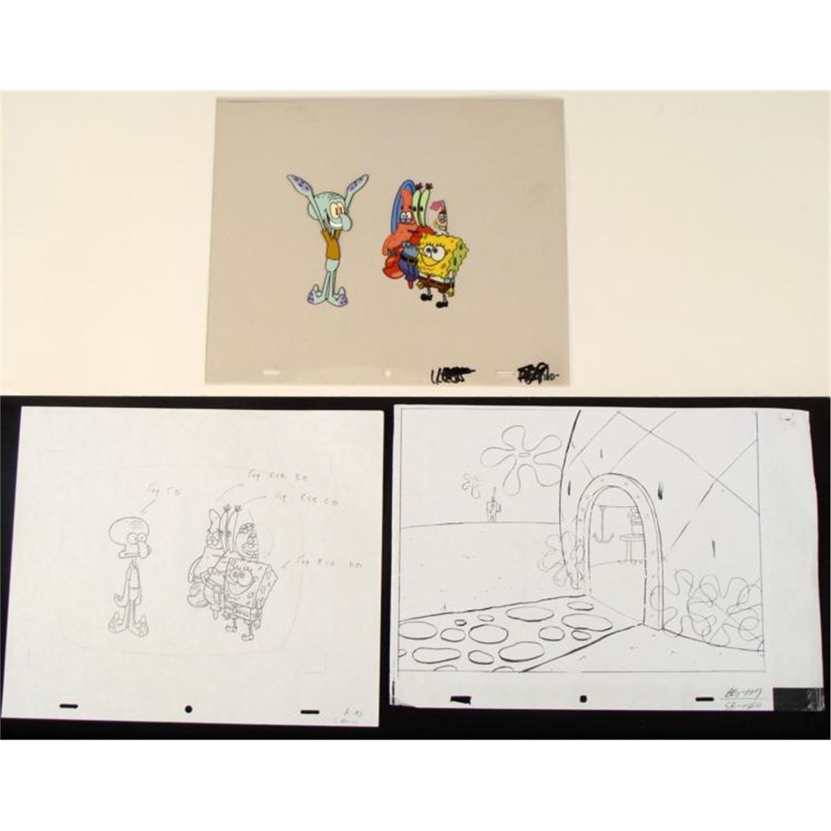 Normal 0 false false false MicrosoftInternetExplorer4 /* Style Definitions */ table.MsoNormalTable{mso-style-name:"Table Normal";mso-tstyle-rowband-size:0;mso-tstyle-colband-size:0;mso-style-noshow:yes;mso-style-parent:"";mso-padding-alt:0in 5.4pt 0in 5.4pt;mso-para-margin:0in;mso-para-margin-bottom:.0001pt;mso-pagination:widow-orphan;font-size:10.0pt;font-family:"Times New Roman";mso-ansi-language:#0400;mso-fareast-language:#0400;mso-bidi-language:#0400;}This original animation cel, drawing, and photocopied background is from the Nickelodeon TV show SpongeBob Squarepants. The story takes place under the deep blue seain Bikini Bottom, where SpongeBob resides. SpongeBob, who is a yellow,porous sponge, is your typical happy-go-lucky character, as he is always cheerful and enjoys making people laugh. Patrick Star, SpongeBob's neighbor who is a starfish, is your average children's show idiot, as he boasts knowing nothing and is often getting himself into ridiculous situations. Between the homes of these two lies the home of the miserable Squidward, a squid, who is known for being grouchy and playing tricks on SpongeBob and Patrick. Both SpongeBob and Squidward work at the Krusty Krab, a fast food business run by the greedy money-loving Mr. Krabs, a crab, the arch rival of the evil, possibly misunderstood, Plankton. Another neighbor, Sandy Cheeks, an athletic squirrel who normally wears an astronaut's space suit, was introduced in "Tea at the Treedome." She spends most of her time inventing and experimenting. * Look, the gang is all back together... HOORAY!! The cel comes with a bonus drawing of an apparently stunned Squidward standing in front of this friends. The cel also comes with a photocopied background of the outside of Spongebob's house. * * Original Production Animated Cel and DrawingOriginal "rough" animation drawing, in black, red, and blue, with notations in black. Overall Size of Drawing: 10 1/2" x 12 1/2"Overall Size of Cel: 10 1/2" x 12 1/2" Overall Size of Photocopied Background: 10" x 14 1/4" * Very Good ConditionThis is an original hand-painted cel set-up used in the production of an episode of "SpongeBob SquarePants." Each one-of-a-kind set-up represents a slight change in position of the characters. When individually photographed and projected in rapid succession, the images appear to move. * To create production cels, the original animator's drawing is transferred onto an acetate cel (by hand-inking and/or photo copying). The cel is then hand-painted on the reverse side. * The cel, drawing, and photocopied background is ready to be matted andframed. The animator's notations are at the bottom of all of the pieces. The cel consists of several layers. There is some paint fade to Squidward's outline. There is some creases to the photocopied background * *