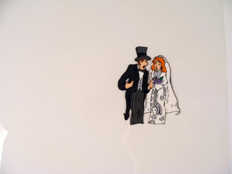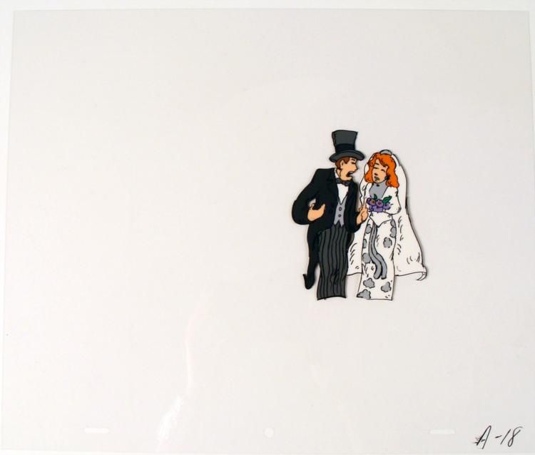 This is an original animation cel of a bride and groom. Bride: Why don't you ever listen to me?? All I hear a lot of hollering... Groom: (raising his voice) WHAT DO YOU MEAN I DON'T LISTEN TO YOU?? ARE YOU KIDDING ME!! Medium: Hand painted acetate cel Cel size: 10 1/2" x 12 1/2" Notations: Bottom of cel Condition: Excellent