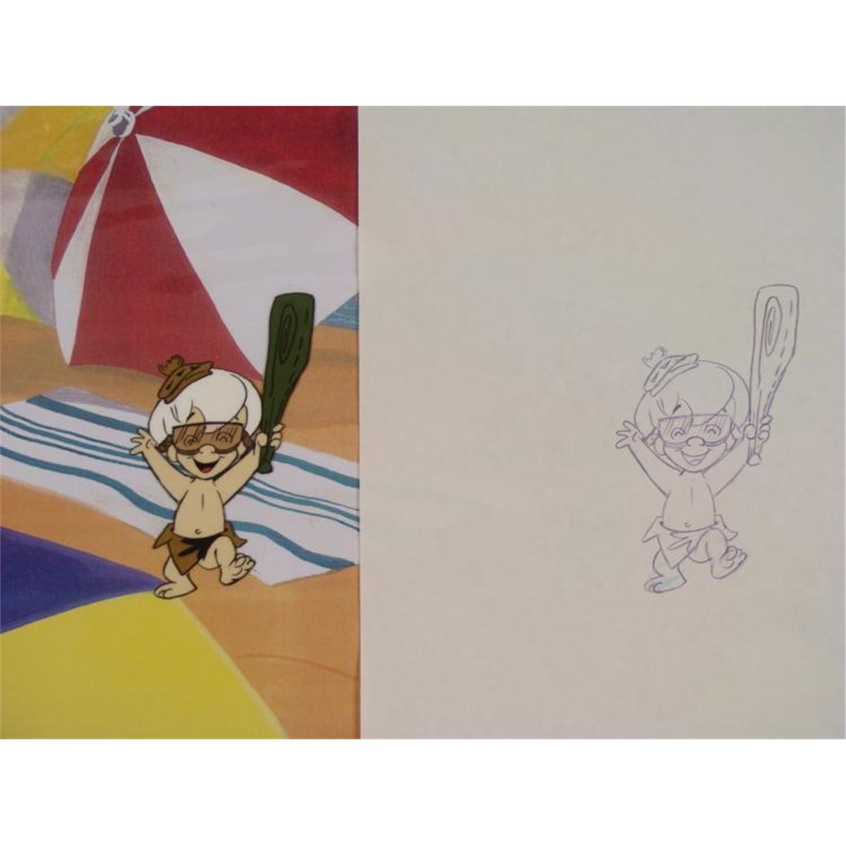 Depicted here, Bam Bam and Pebbles appear to be celebrating something. The cel comes with a matching drawing overlay. * * Original Production Art Cel, Drawing, and Reproduction Background Original "rough" animation drawing, with notations in black. Bam Bam and Pebbles have been outlined in purple Overall Size of the Cel: 10 1/2" x 12 1/2" Overall Size of Reproduction Background: 11" x 13 1/4" * Excellent condition This is an original hand-painted cel set-up used in the production of an episode of "The Flintsones." Each one-of-a-kind set-up represents a slight change in position of the characters. When individually photographed and projected in rapid succession, the images appear to move. * To create production cels, the original animator's drawing is transferred onto an acetate cel (by hand-inking and/or photo copying). The cel is then hand-painted on the reverse side. The background accompanying this set-up is a reproduction background. * * The cel, drawing, and background are ready to be matted and framed. The animator's notations are shown at the bottom of the cel and drawing. *