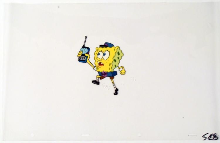 This original animation cel is from the Nickelodeon TV show SpongeBob Squarepants. The story takes place under the deep blue sea in Bikini Bottom, where SpongeBob resides. SpongeBob, who is a yellow, porous sponge, is your typical happy-go-lucky character, * as he is always cheerful and enjoys making people laugh. Patrick Star, SpongeBob's neighbor who is a starfish, is your average children's show idiot, as he boasts knowing nothing and is often getting himself into ridiculous situations. Between the homes of * these two lies the home of the miserable Squidward, a squid, who is known for being grouchy and playing tricks on SpongeBob and Patrick. Both SpongeBob and Squidward work at the Krusty Krab, a fast food business run by the greedy money-loving Mr. Krabs, a * crab, the arch rival of the evil, possibly misunderstood, Plankton. Another neighbor, Sandy Cheeks, an athletic squirrel who normally wears an astronaut's space suit, was introduced in "Tea at the Treedome." She spends most of her time inventing and experimenting. * * Don't worry, I'm on it... * * * * * Original Production Animated Cel Overall Size of Cel: 10 1/2" x 16 1/2" Very Good Condition * This is an original hand-painted cel was used in the production of an episode of "SpongeBob SquarePants." Each one-of-a-kind cel * represents a slight change in position of the characters. When individually photographed and projected in rapid succession, the images appear to move. * * To create production cels, the original animator's drawing is transferred onto an acetate cel (by hand-inking and/or photo copying). The cel is then hand-painted on the reverse side. * * * The cel is ready to be matted and framed. The animator's notations are at the bottom of the cel. There is some slight paint fade to Spongebob's outline. * * *