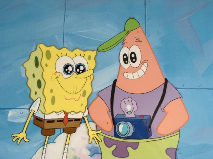 This animation cel and reproduction background are from the Nickelodeon TV show SpongeBob Squarepants. The story takes place under the deep blue sea in Bikini Bottom, where SpongeBob resides. SpongeBob, who is a yellow, porous sponge, is your typical happy-go-lucky character, as he is always cheerful and enjoys making people laugh. Patrick Star, SpongeBob's neighbor who is a starfish, is your average children's show idiot, as he boasts knowing nothing and is often getting himself into ridiculous situations. Between the homes of these two lies the home of the miserable Squidward, a squid, who is known for being grouchy and playing tricks on SpongeBob and Patrick. Both SpongeBob and Squidward work at the Krusty Krab, a fast food business run by the greedy money-loving Mr. Krabs, a crab, the arch rival of the evil, possibly misunderstood, Plankton. Another neighbor, Sandy Cheeks, an athletic squirrel who normally wears an astronaut's space suit, was introduced in "Tea at the Treedome." She spends most of her time inventing and experimenting. SpongeBob and Patrick looks happyOriginal Printed Background and Animated Cel Overall Size of Background: 11" x 17" Overall Size of the Cel: 10 1/2" x 12 1/2" Very good condition This is an original hand-painted cel set-up used in the production of an episode of "SpongeBob SquarePants." Each one-of-a-kind set-up represents a slight change in position of the characters. When individually photographed and projected in rapid succession, the images appear to move.