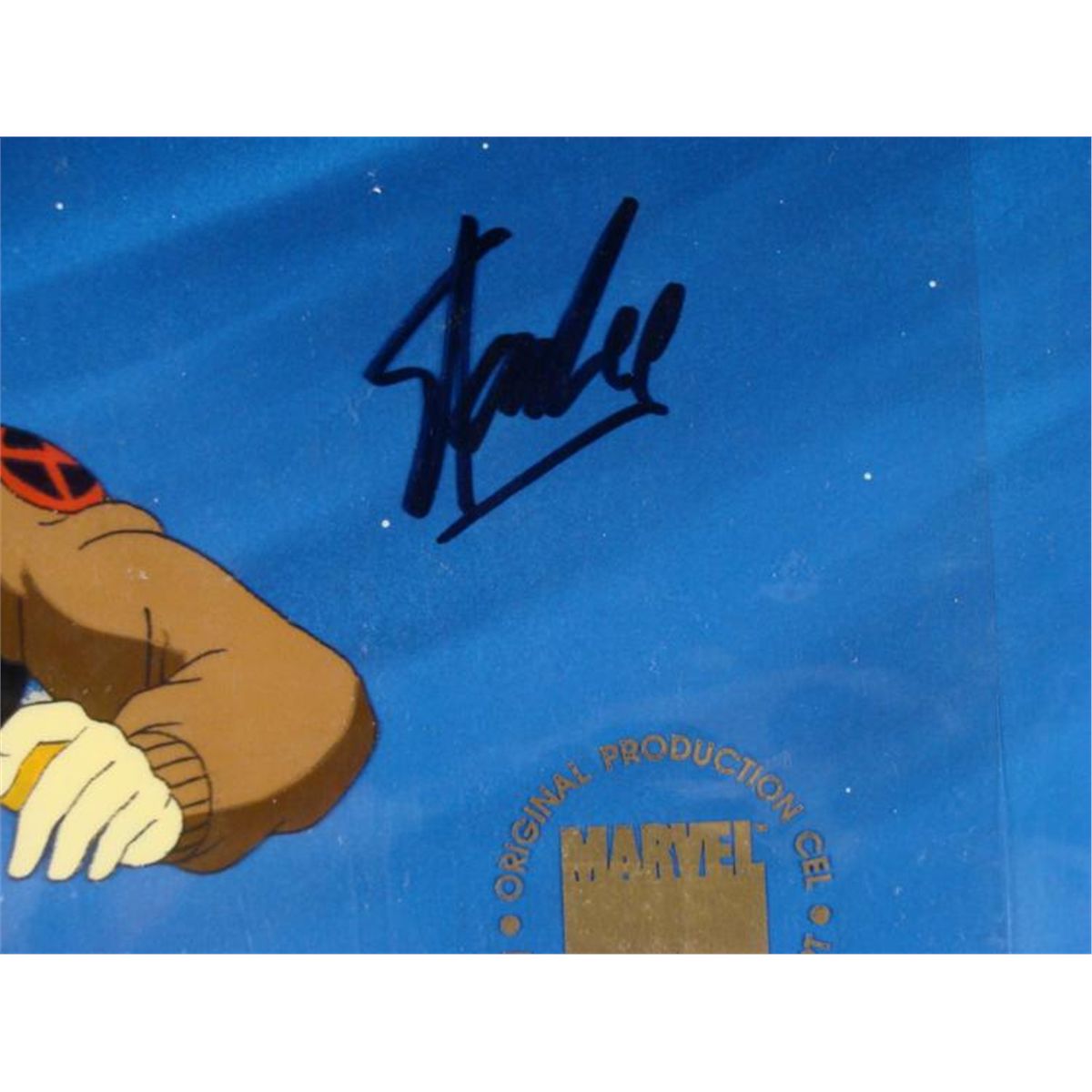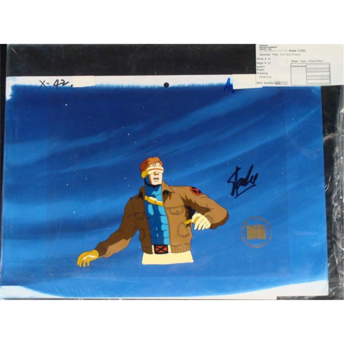 This is an original signed production cel and background from the hit series X-Men. Stan Lee signature is located on the right side of cel in black sharpie. * Under a cloud of increasing anti-mutant sentiment, Professor Xavier creates a haven at his Westchester mansion to train young mutants to use their powers for the benefit of humanity, and to prove mutants can be heroes. Xavier recruited Cyclops, Iceman, Angel, Beast and Jean Grey calling them "X-Men" because they possessed the "x-gene", an ability normal humans lacked. Early issues introduced the team's arch enemy, Magneto and his Brotherhood of Evil Mutants, who would later battle the X-Men for years. * Uhhhh, guys... A little help here... * * Original Animated Cel Overall Size of the Cel: 10 1/2" x 12 1/2" Overall Size of the background: 10 1/4" x 14 1/4" Excellent Condition This is an original hand-painted cel set-up used in the production of an episode of X-Men titled "Dark Phoenix." Each one-of-a-kind set-up represents a slight change in position of the characters. When individually photographed and projected in rapid succession, the images appear to move. * To create production cels, the original animator's drawing is transferred onto an acetate cel (by hand-inking and/or photo copying). The cel is then hand-painted on the reverse side. The background accompanying this set-up is an original production background. * The cel and original background is ready to be matted and framed. The animators notations are located at the top of the cel and background. A certificate of Authenticity from Marvel is on the back of background. The Marvel Seal is located at the bottom right of the cel. The cel and background are in a protective sleeve An information card about the episode is located at the top right of the protective sleeve. *