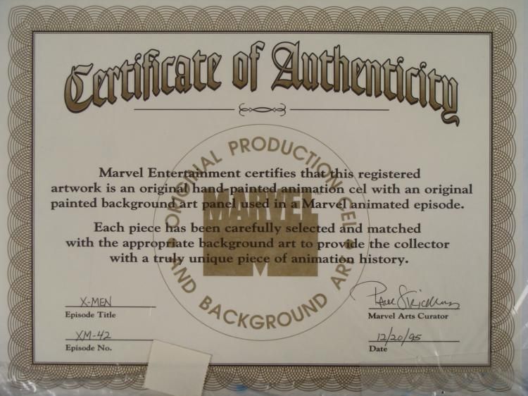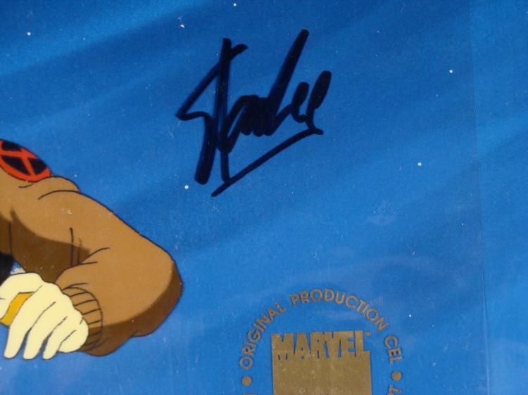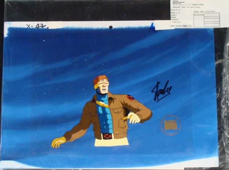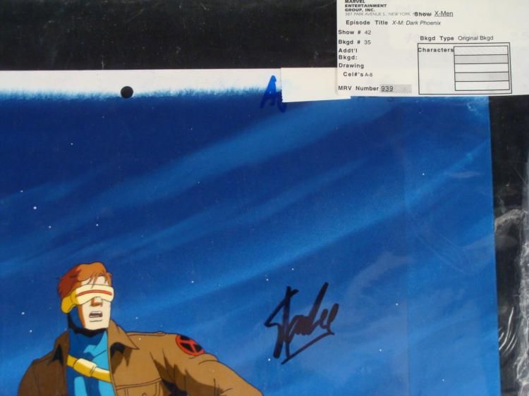 This is an original signed production cel and background from the hit series X-Men. Stan Lee signature is located on the right side of cel in black sharpie. * Under a cloud of increasing anti-mutant sentiment, Professor Xavier creates a haven at his Westchester mansion to train young mutants to use their powers for the benefit of humanity, and to prove mutants can be heroes. Xavier recruited Cyclops, Iceman, Angel, Beast and Jean Grey calling them "X-Men" because they possessed the "x-gene", an ability normal humans lacked. Early issues introduced the team's arch enemy, Magneto and his Brotherhood of Evil Mutants, who would later battle the X-Men for years. * Uhhhh, guys... A little help here... * * Original Animated Cel Overall Size of the Cel: 10 1/2" x 12 1/2" Overall Size of the background: 10 1/4" x 14 1/4" Excellent Condition This is an original hand-painted cel set-up used in the production of an episode of X-Men titled "Dark Phoenix." Each one-of-a-kind set-up represents a slight change in position of the characters. When individually photographed and projected in rapid succession, the images appear to move. * To create production cels, the original animator's drawing is transferred onto an acetate cel (by hand-inking and/or photo copying). The cel is then hand-painted on the reverse side. The background accompanying this set-up is an original production background. * The cel and original background is ready to be matted and framed. The animators notations are located at the top of the cel and background. A certificate of Authenticity from Marvel is on the back of background. The Marvel Seal is located at the bottom right of the cel. The cel and background are in a protective sleeve An information card about the episode is located at the top right of the protective sleeve. *