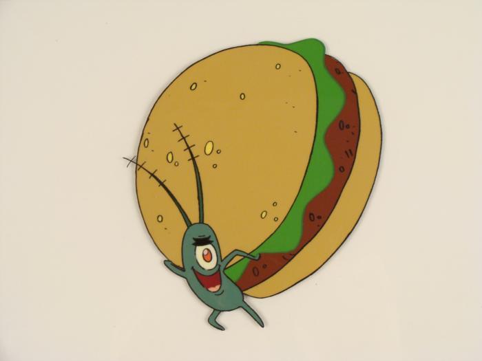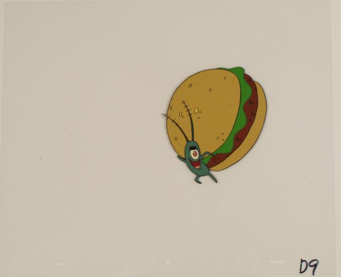 This original animation cel is from the Nickelodeon TV show SpongeBob Squarepants. The story takes place under the deep blue sea in Bikini Bottom, where SpongeBob resides. SpongeBob, who is a yellow, porous sponge, is your typical happy-go-lucky character, as he is always cheerful and enjoys making people laugh. Patrick Star, SpongeBob's neighbor who is a starfish, is your average children's show idiot, as he boasts knowing nothing and is often getting himself into ridiculous situations. Between the homes of these two lies the home of the miserable Squidward, a squid, who is known for being grouchy and playing tricks on SpongeBob and Patrick. Both SpongeBob and Squidward work at the Krusty Krab, a fast food business run by the greedy money-loving Mr. Krabs, a crab, the arch rival of the evil, possibly misunderstood, Plankton. Another neighbor, Sandy Cheeks, an athletic squirrel who normally wears an astronaut's space suit, was introduced in "Tea at the Treedome." She spends most of her time inventing and experimenting. It's a bird... No, it's a plane... It's... PLANKTON?!?!?!?Original Production Animated Cel Overall Size of Cel: 10 1/2" x 12 1/2" Excellent ConditionThis is an original hand-painted cel set-up used in the production of an episode of "SpongeBob SquarePants." Each one-of-a-kind set-up represents a slight change in position of the characters. When individually photographed and projected in rapid succession, the images appear to move.