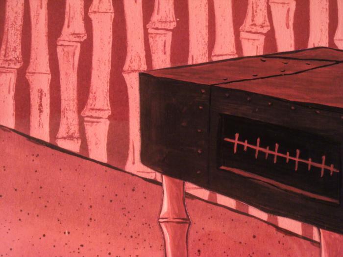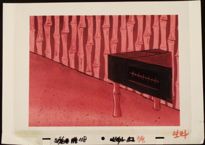 To create production cels, the original animator's drawing is transferred onto an acetate cel (by hand-inking and/or photo copying). The cel is then hand-painted on the reverse side. The printed background is ready to be matted and framed. It is a colored background with a cel and has the animator's notations at the bottom of the background and the cel. The background is a printed reproduction background. The background has been glued to a piece of paper. The notations on the cel have been taped to the cel.