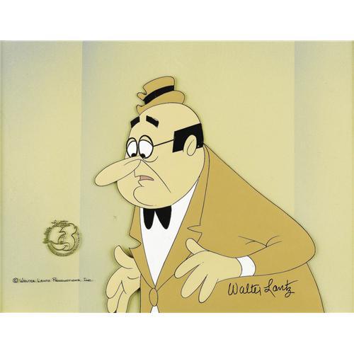 <B>Man with Hat Animation Production Cel and Background Original Art (Walter Lantz Productions, undated).</B></I> Lantz fans will love this original hand-inked and hand-painted animation production cel, and hand-painted background art! Both have an image area measures 11" x 8.25". In Excellent condition. Includes Walter Lantz's signature, and a Walter Lantz Productions seal. <BR><BR><B>Important notice:</B> Heritage usually auctions material at the rate of 200-250 lots per hour. On some occasions eBay Live bid software or the Internet may not be able to keep up with the pace of the auction. We recommend placing a realistic absentee bid now as insurance to avoid disappointment. Occasionally the auctioneer may eliminate or reject an eBay Live bid, and the auctioneer may also reopen a lot after the close of the eBay live bidding (usually because we missed an audience bid), and may reject your bid even if it shows you as the winning bidder. By bidding via eBay Live, you agree that Heritage may award the lot to another bidder at its sole discretion under the circumstances described above or any other reasonable circumstances. Since eBay bids are not shown to us until we open the lot on the floor, we treat those bids just like floor bids. In most cases the floor responds before the eBay bid is presented to us, due to Internet lag time, so for consistency we have made it a policy that floor bids are always considered first over tie eBay live bids. Also please note that all Heritage lots purchased through eBay Live carry a 22.5% Buyer's Premium. Please make sure you read the Terms and Conditions before you bid. This lot is being auctioned in conjunction with a live floor auction by Heritage Auction Galleries. All final auction and invoice information will be supplied by Heritage Auction Galleries, and all other information should be considered preliminary. Lot:41001 <BR><BR><B>Winning Notification and Billing:</B> After the FINAL session in this auction is complete, Heritage will send e-mail and snail mail invoices. This process normally takes several days. All final auction and invoice information will be supplied by Heritage Auction Galleries, and all other information should be considered preliminary. <BR><BR>This auction will be conducted on a live auction floor and over the Internet through eBay Live. If you choose to place an absentee bid, please take a moment to <font color='#0000ff'><u><a href='http://pages.ebay.com/liveauctions/help/before/laabsentee.html'>learn how eBay Live absentee bidding works</a></u></font><font color='#000000'>