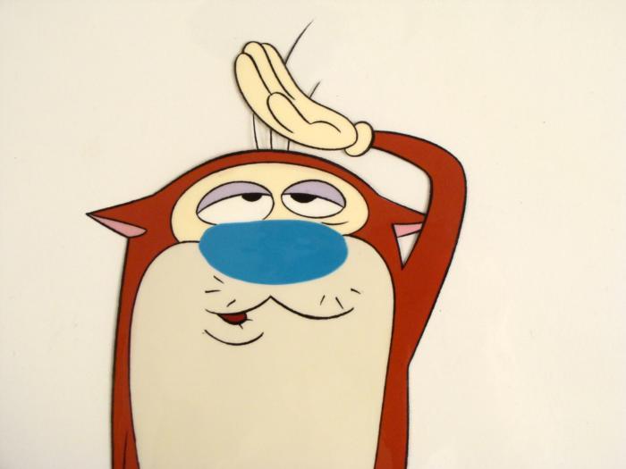 This is an original production animation cel from the Nickelodeon TV show Ren & Stimpy. The show follows two characters - Ren, a crazy Chihuahua - and - Stimpy, an incredibly stupid cat - as they think up to all kinds of hair brained schemes and get themselves into some sticky situations. The Ren and Stimpy Show debuted in August 1991 with a two-part episode, 'Stimpy's Big Day / The Big Shot' and became an instant hit. It was the third Nicktoon ever to be aired on the Network alongside Doug and Rugrats. Why is Stimpy looking up?Original Production Art Cel Overall Size of the Cel: 10 1/2" x 12 1/2" Very Good condition This is an original hand-painted cel set-up used in the production of an episode of "The Ren & Stimpy Show." Each one-of-a-kind set-up represents a slight change in position of the characters. When individually photographed and projected in rapid succession, the images appear to move.
